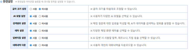 초기값을 설정하면 챗봇이 열릴 때마다 자동으로 적용되어, 언제든지 익숙하고 편안한 환경에서 대화할 수 있습니다.