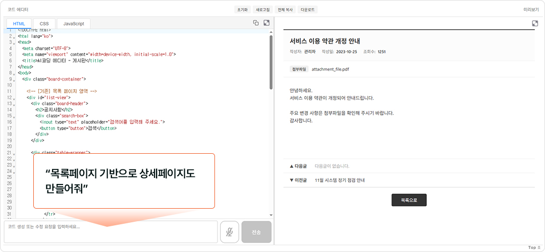 단순히 '공지사항 게시판을 만들어줘'라고 입력했을 뿐이지만, AI는 사용자가 놓치기 쉬운 세부 요소까지 완벽하게 구현했습니다.