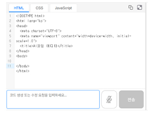 좌측에서는 탭을 눌러 HTML, CSS, JavaScript 코드를 각각 확인할 수 있고, 수정이나 보완이 필요하다면 추가 요청을 통해 쉽게 반영할 수 있습니다.
