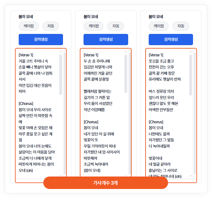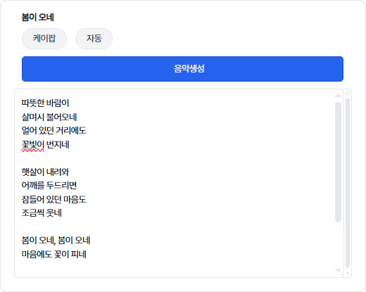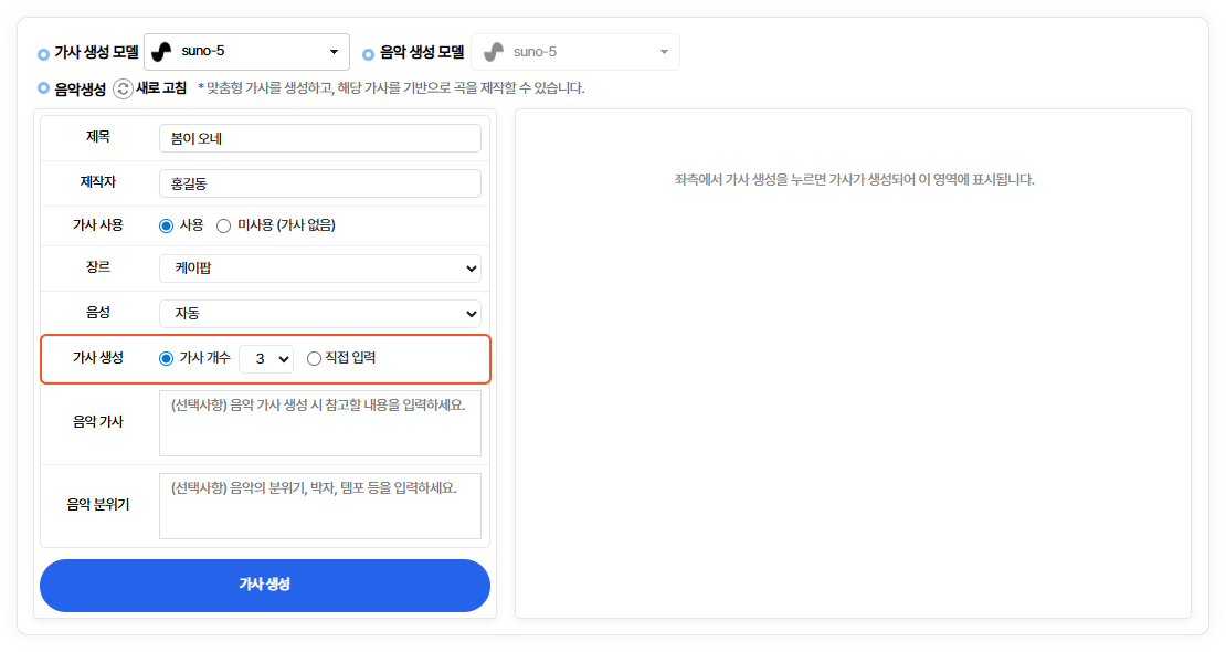 음악 생성 시 참고할 가사를 입력합니다.미입력시 제목을 기반으로 가사가 자동으로 생성됩니다.