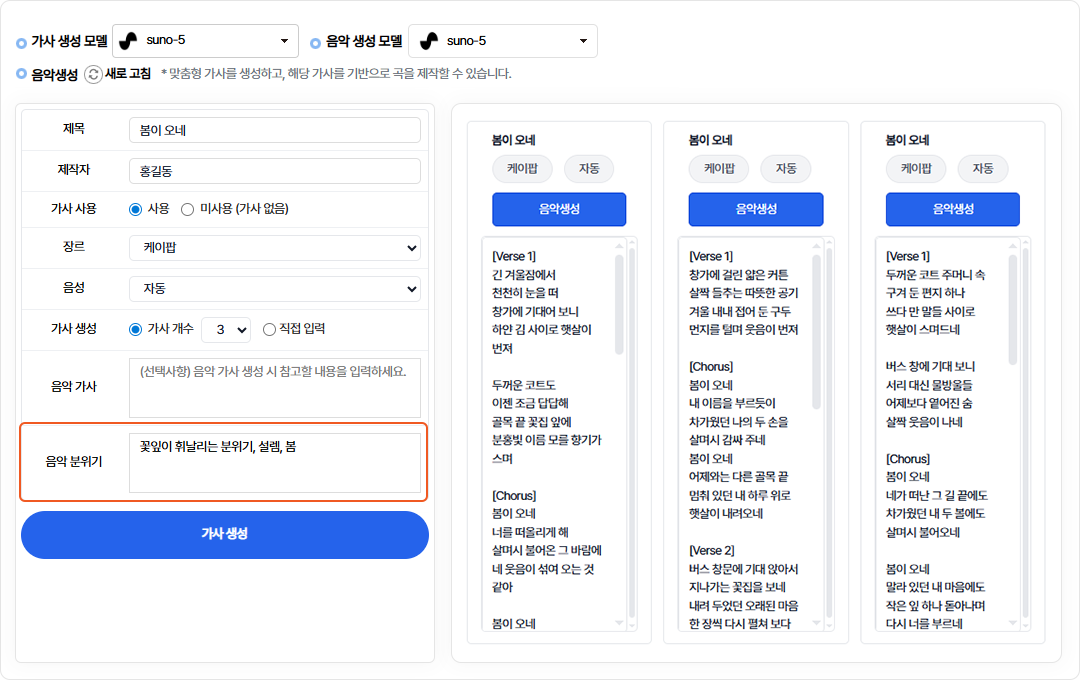 생성할 음악의 스타일과 감성을 설정합니다.음악 분위기 미입력시 장르에 맞는 분위기가 자동으로 적용됩니다.