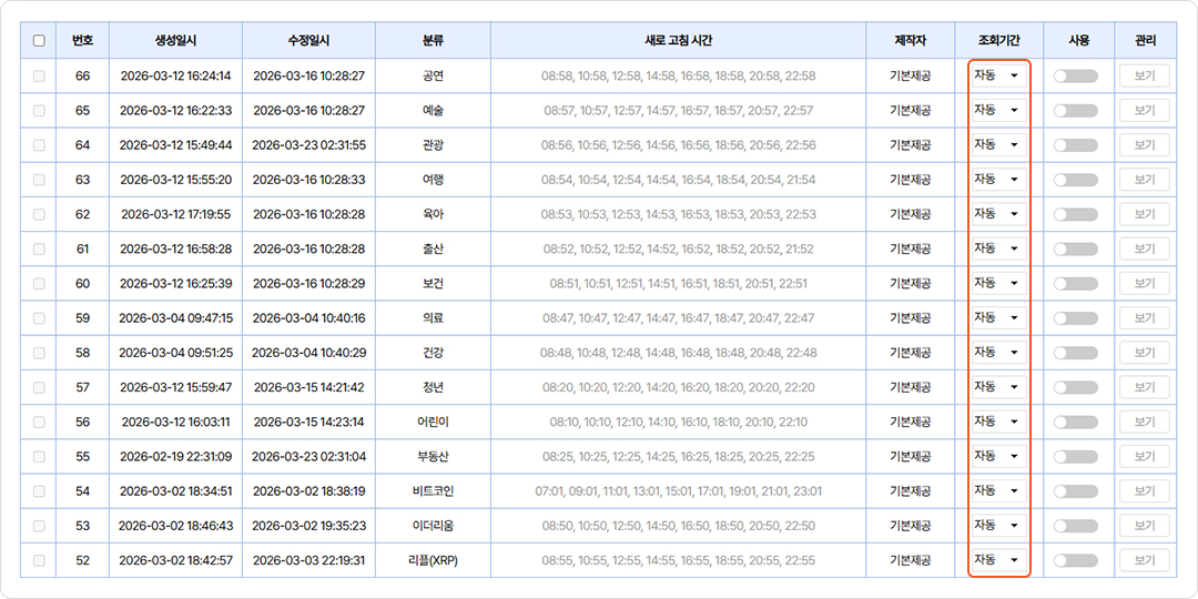 ‘자동’ 설정은 조회 기간을 따로 지정하지 않아도 시스템에 미리 설정된 기준에 따라 최신 뉴스를 자동으로 수집하는 기능입니다.