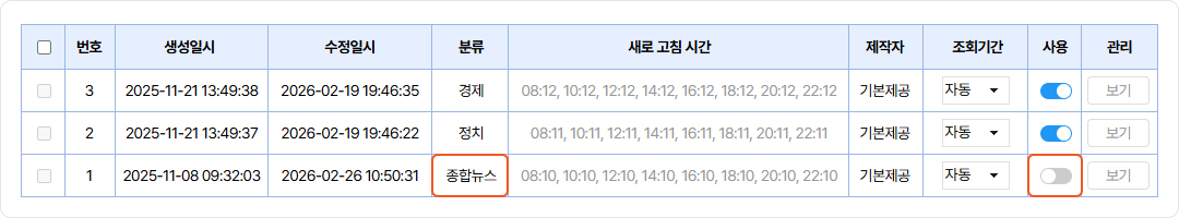 종합뉴스의 사용여부를 ON으로 설정하여 해당 탭이 노출됩니다.