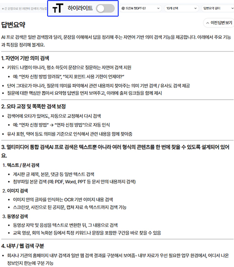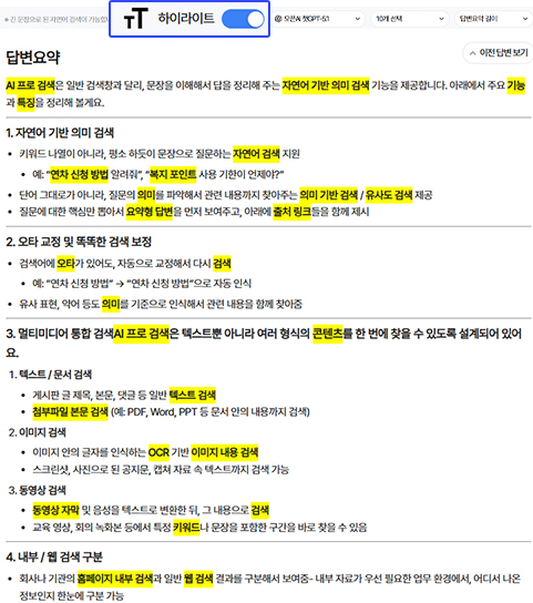 이때 하이라이팅 기능 버튼을 눌러 작동시키면 읽기 어려운 긴 검색 결과에서도 원하는 정보를 즉시 확인할 수 있습니다.
