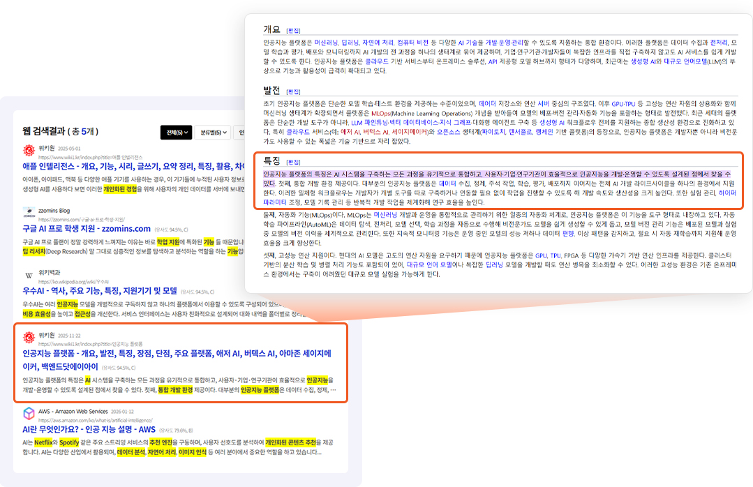 검색어와 유사한 키워드나 내용을 페이지 이동 후에도 자동으로 하이라이팅합니다.
