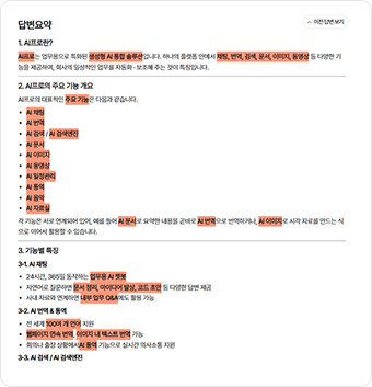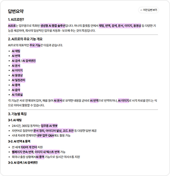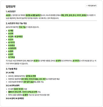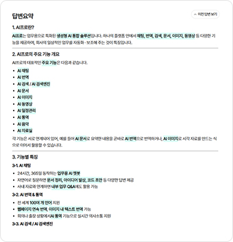 “AI 프로 검색의 주요 기능이 뭐야?”와 같은 질문을 하면 여러 기능에 대한 설명이 긴 텍스트로 제공됩니다.