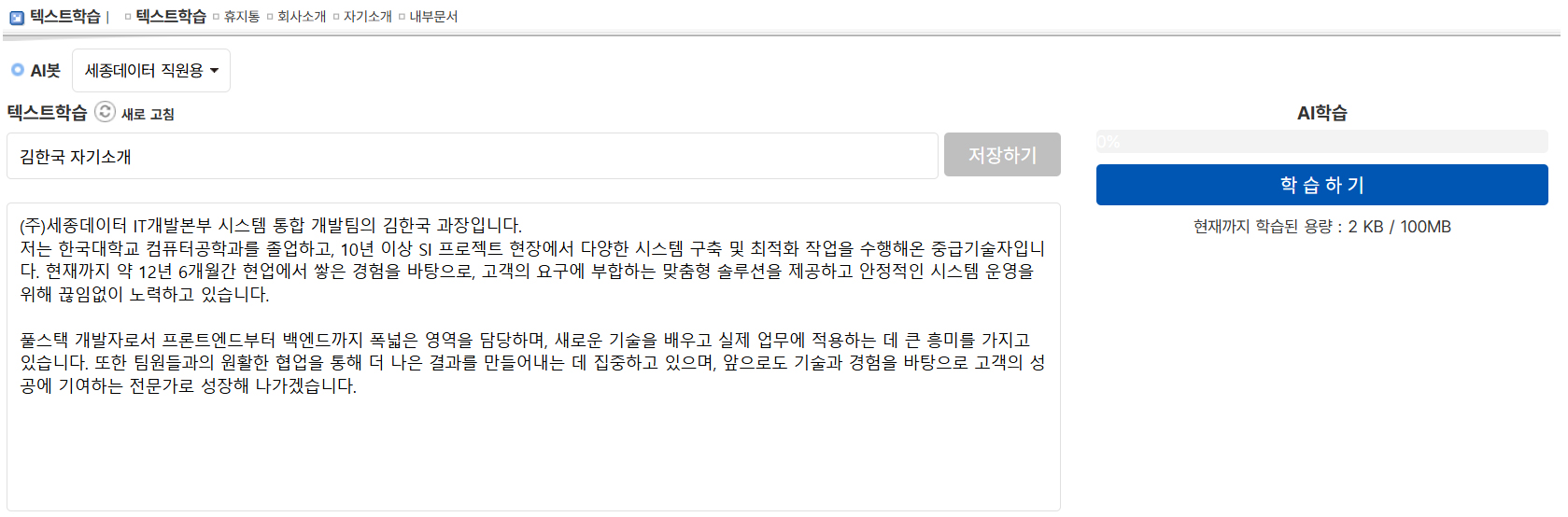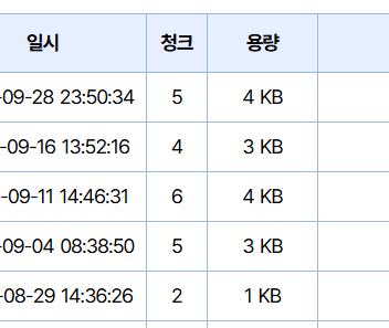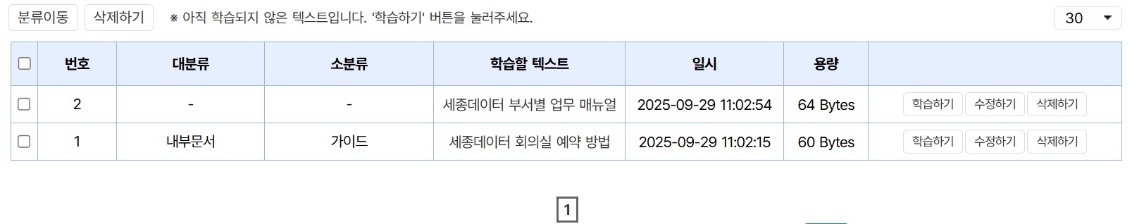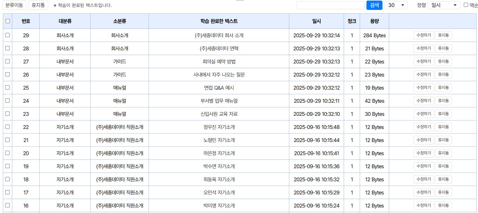 | 번호 | 대분류 | 소분류 | 학습 완료한 텍스트 | 일시 | 청크 | 용량 | ||