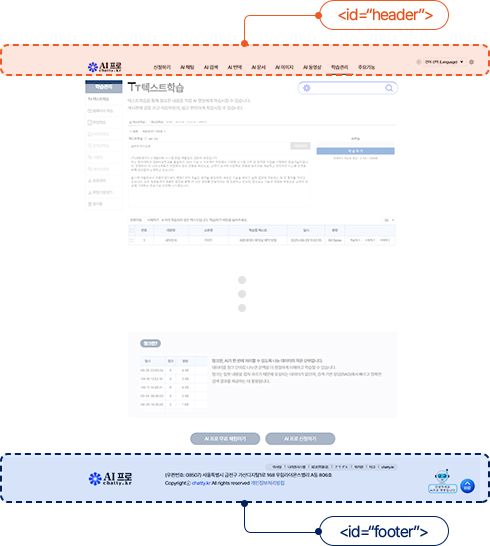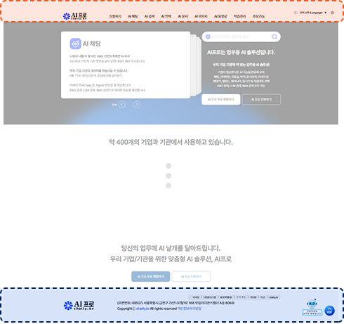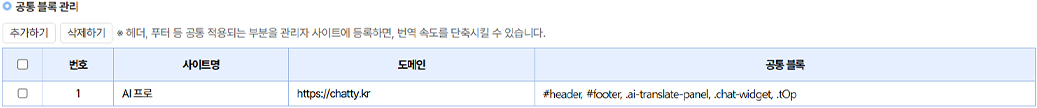 위 이미지는 chatty.kr 사이트의 공통 영역 예시로, 헤더와 푸터는 물론 AI 프로 홈페이지 번역기, 채팅 아이콘, 페이지 상단 이동 버튼 등을 공통 부분으로 설정해 관리하고 있습니다.