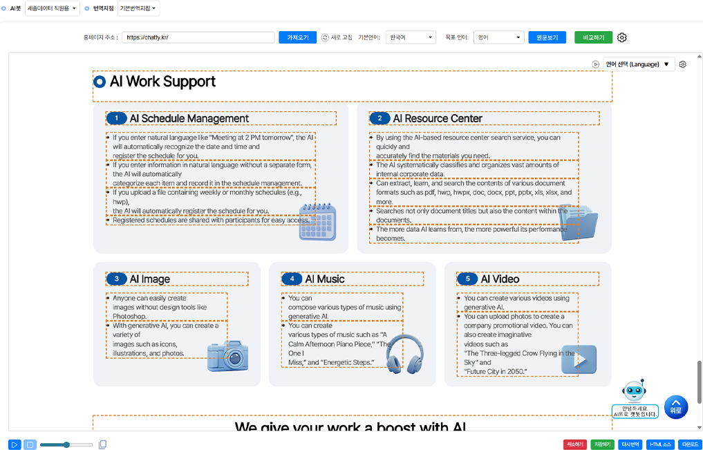 관리자는 AI 번역 > 홈페이지 번역에서 번역된 홈페이지의 텍스트를 직접 수정할 수 있습니다.