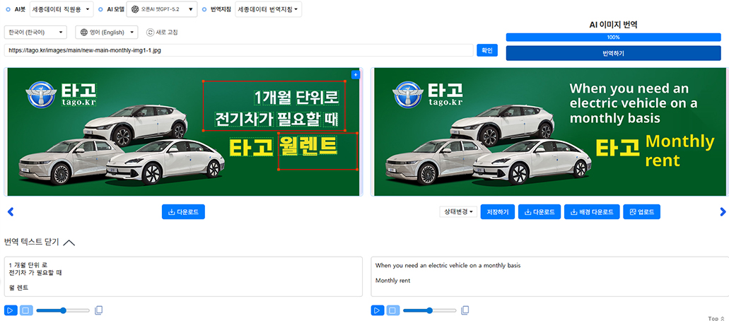 배너 이미지 등 시각 요소에 포함된 작은 문구까지 정확하게 번역된 결과를 확인할 수 있습니다.