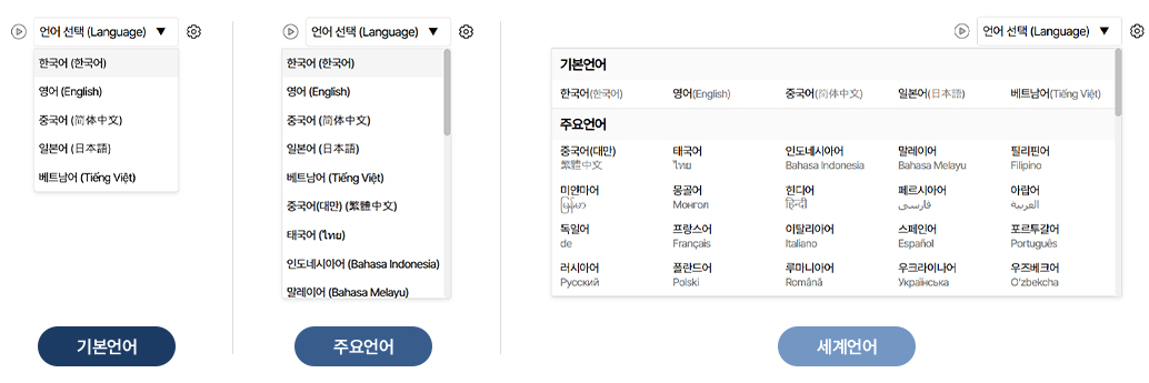 한국에서 가장 많이 사용되는 5개의 언어(한국어, 영어, 중국어, 일본어, 베트남어)로 구성되어 있습니다.