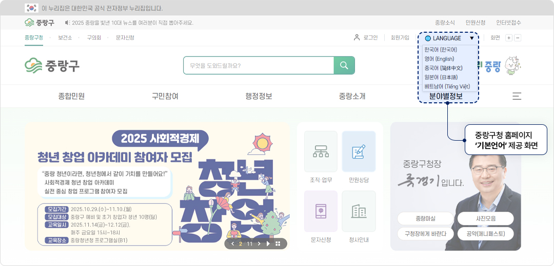 중랑구청 홈페이지의 기본언어 옵션은 국내에서 가장 많이 사용되는 5개 언어(한국어, 영어, 중국어, 일본어, 베트남어)로 구성되어 있습니다.