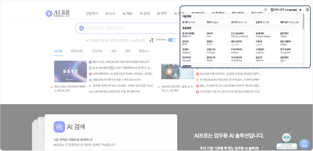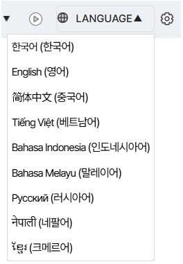 AI 프로에서는 기본언어 5개, 주요언어 20개, 세계언어 79개로 총 104개의 번역 언어를 지원하고 있습니다.
