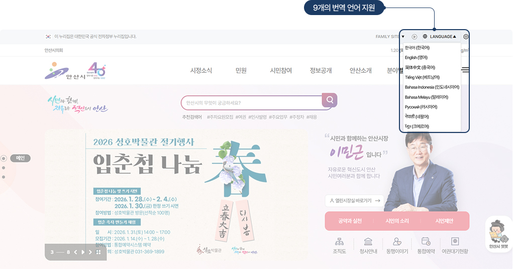 위 예시 이미지는 경기도 안산시 홈페이지에 한국어, 영어, 중국어, 베트남어, 인도네시아어, 말레이어, 러시아어, 네팔어, 크메르어 총 9개의 번역 언어가 적용되어 있는 모습입니다.