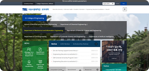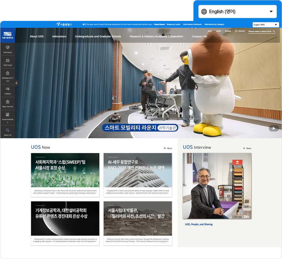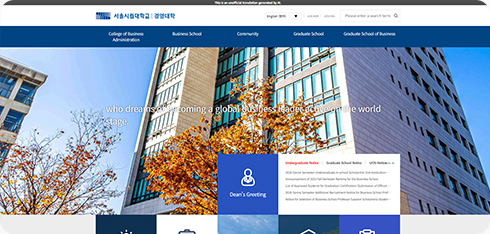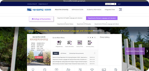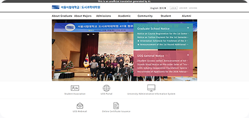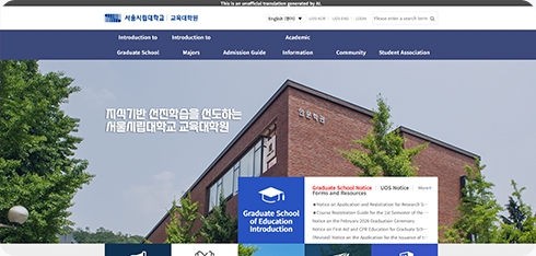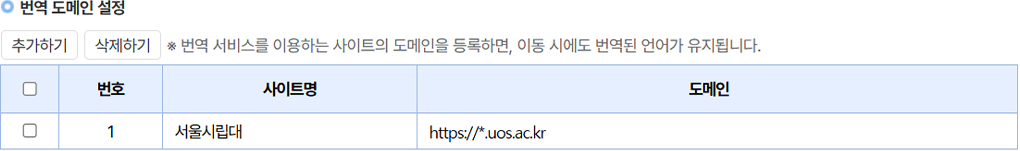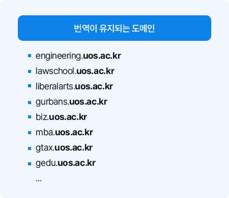 예를 들어, 단과대학이나 대학원 홈페이지와 같이 ‘engineering.uos.ac.kr’, ‘lawschool.uos.ac.kr’ 등의 주소는 모두 ‘*.uos.ac.kr’ 도메인에 해당하므로, 페이지 이동 시에도 별도의 설정 없이 번역 기능이 계속 적용됩니다.