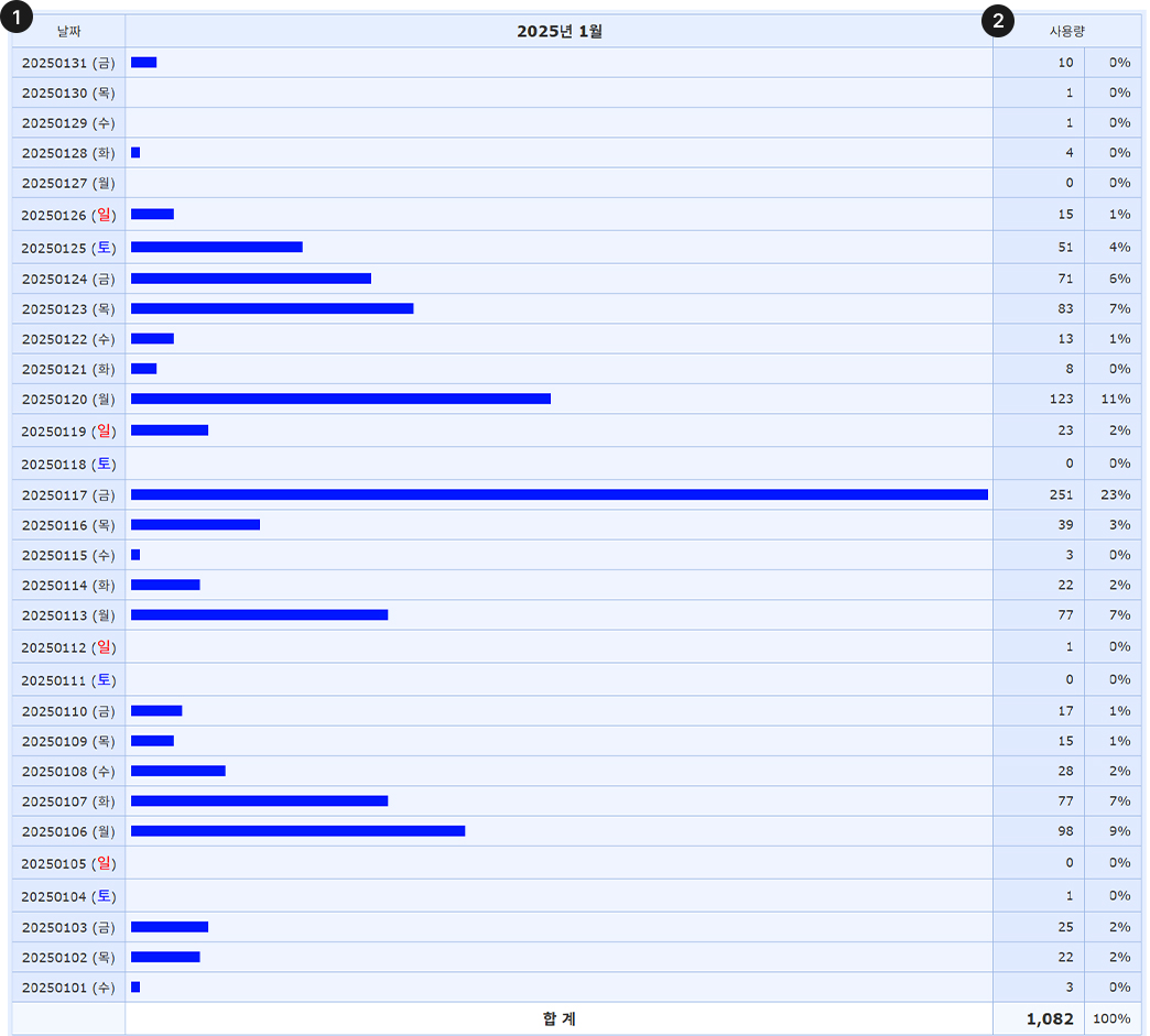이를 통해 각 날짜별 사용량의 크기와 월 전체 대비 비중을 비교하며 사용자의 패턴을 확인할 수 있습니다.