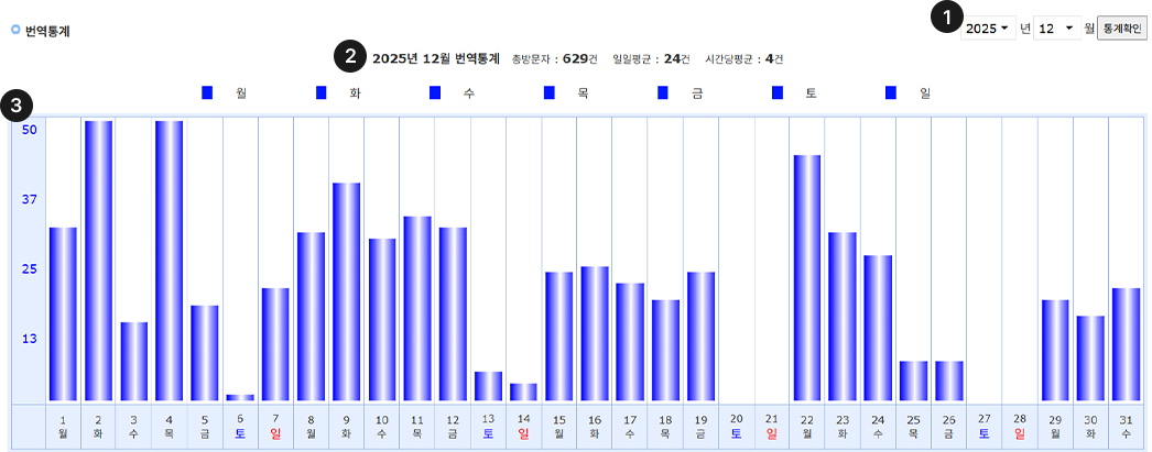 번역 사용통계 페이지에서 월별, 일별, 시간별 통계 데이터를 확인할 수 있습니다.
