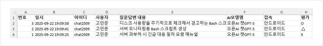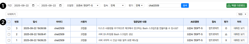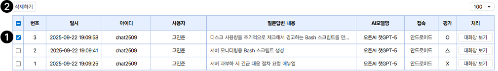 | 번호 | 일시 | 아이디 | 사용자 | 질문답변 내용 | AI모델명 | 접속 | 평가 | 처리 | |