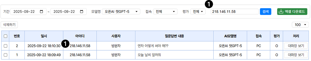 | 2 | 최고관리자 | 2025-09-22 19:20:42 | asadal | 아사달 | 218.146.11.58 | 사용기록 | [채팅]_채팅기록_20250922.xlsx | 엑셀다운로드 |