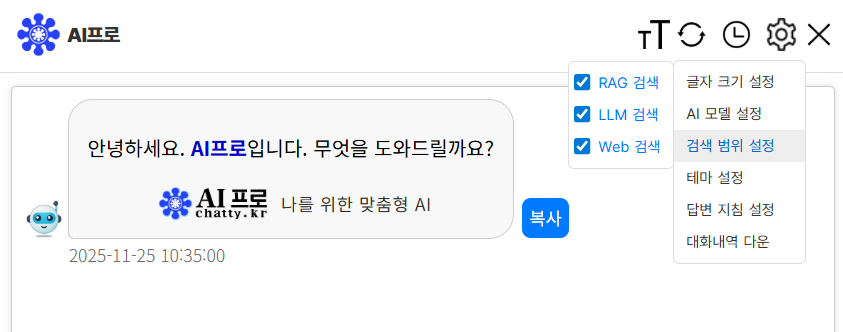 AI가 사전에 학습시킨 자체 RAG 데이터를 우선 검색하여 답변을 제공합니다.