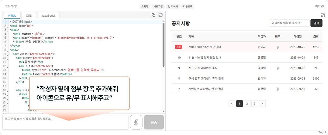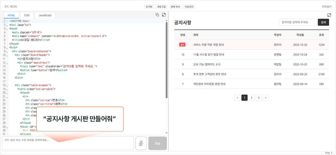단순히 '공지사항 게시판을 만들어줘'라고 입력했을 뿐이지만, AI는 사용자가 놓치기 쉬운 세부 요소까지 완벽하게 구현했습니다.