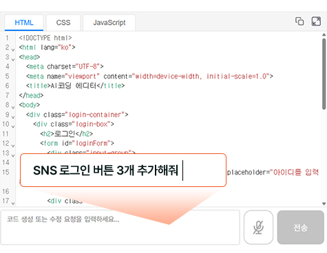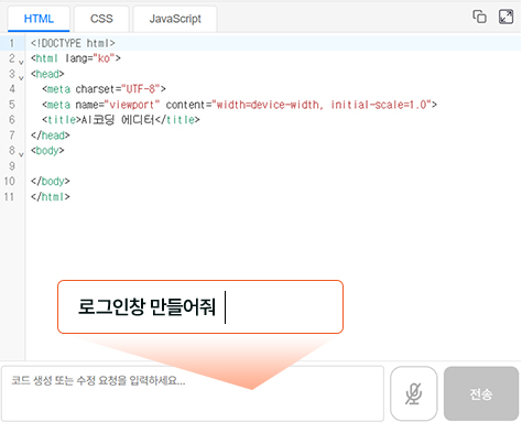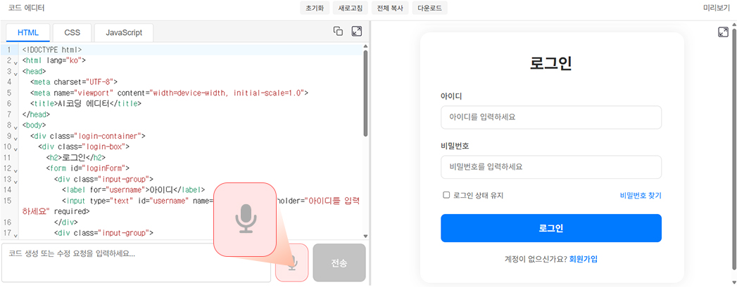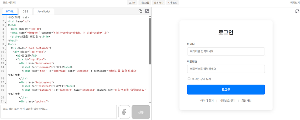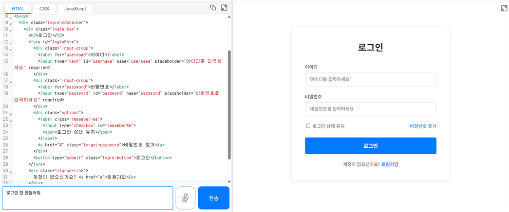 좌측 입력창에 “로그인창 만들어줘”라고 입력만 하면 AI 프로가 순식간에 HTML, CSS, JavaScript가 포함된 로그인 페이지 예시 코드를 자동으로 생성하여 줍니다.