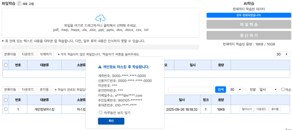 파일 학습 과정에서 업로드되는 문서에는 눈에 잘 띄지 않는 형태로 개인정보가 포함되어 있을 수 있습니다.
