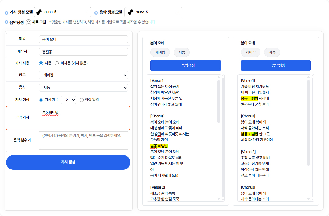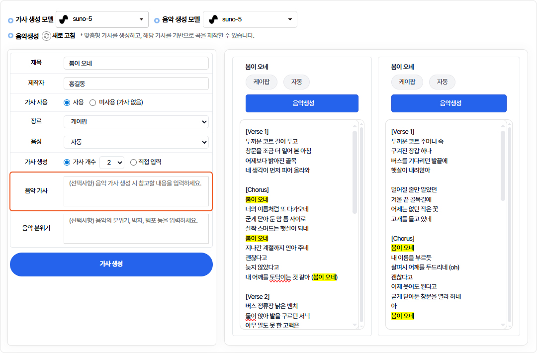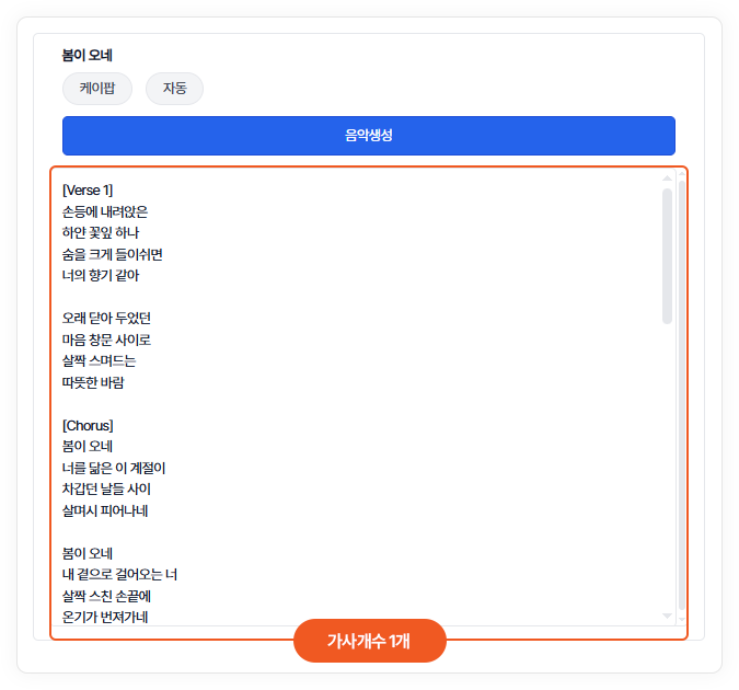 음악 생성 시 참고할 가사를 입력합니다.미입력시 제목을 기반으로 가사가 자동으로 생성됩니다.