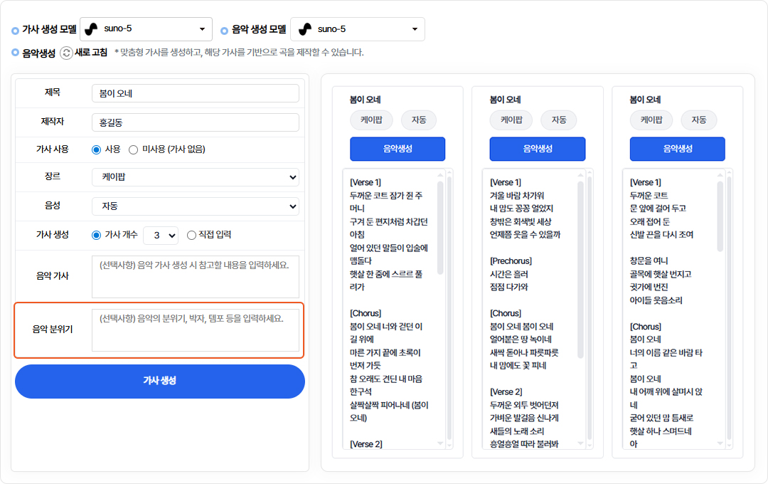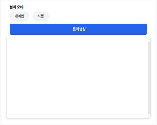 생성할 음악의 스타일과 감성을 설정합니다.음악 분위기 미입력시 장르에 맞는 분위기가 자동으로 적용됩니다.