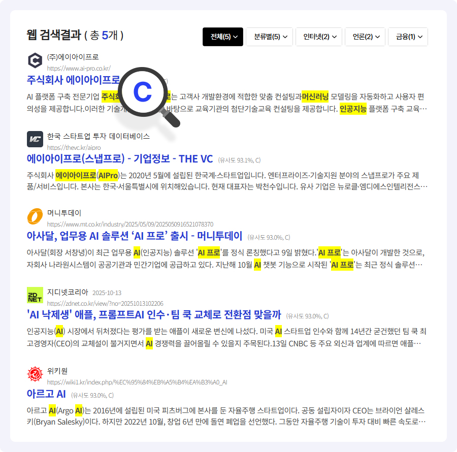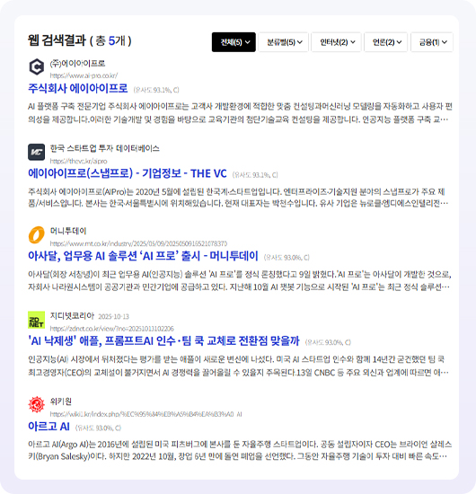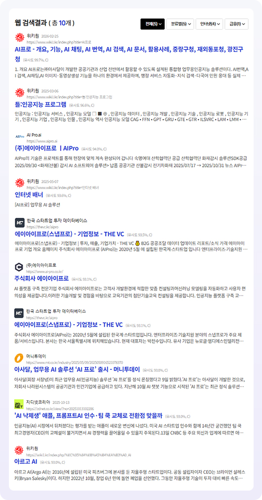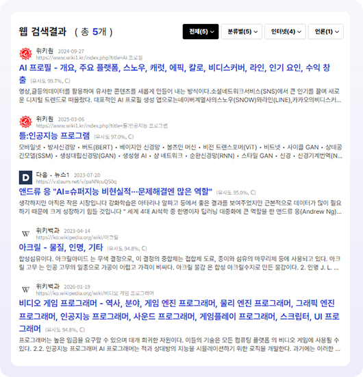 해당 사이트들은 유사도를 기준으로 내림차순으로 확인이 가능하며, 관리자에서 설정이 가능합니다.