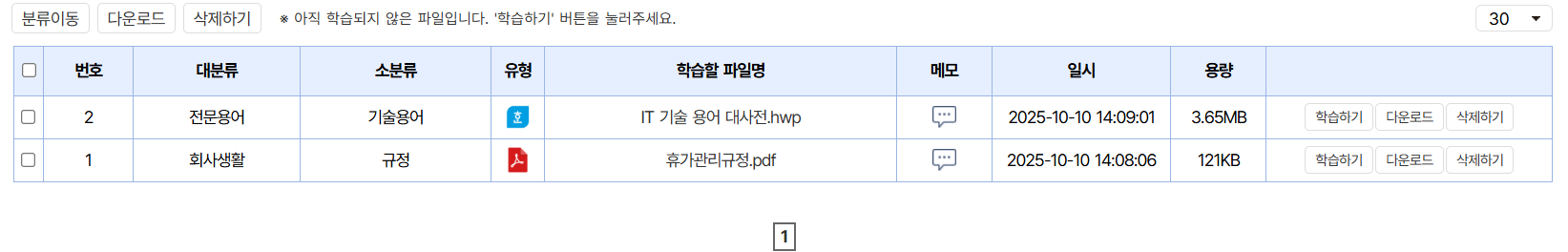 | 번호 | 대분류 | 소분류 | 유형 | 학습할 파일명 | 메모 | 일시 | 용량 | ||
