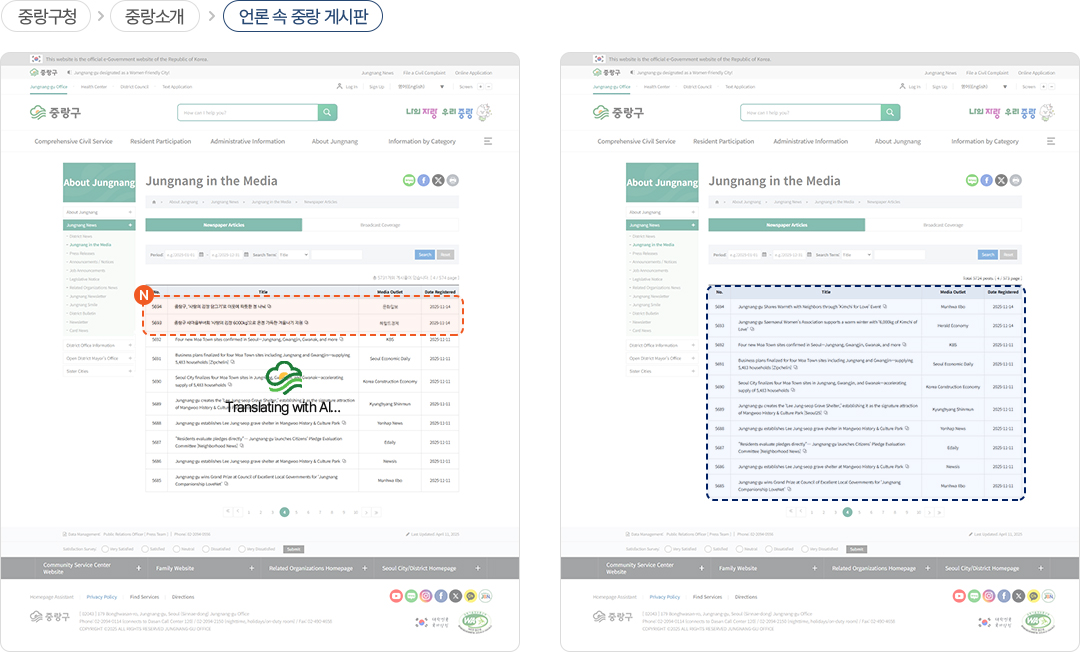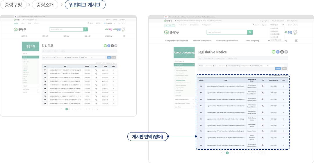 중랑구청 사이트 ‘입법예고’ 게시판에서 AI 프로 번역기를 이용해 영어로 번역한 모습입니다.