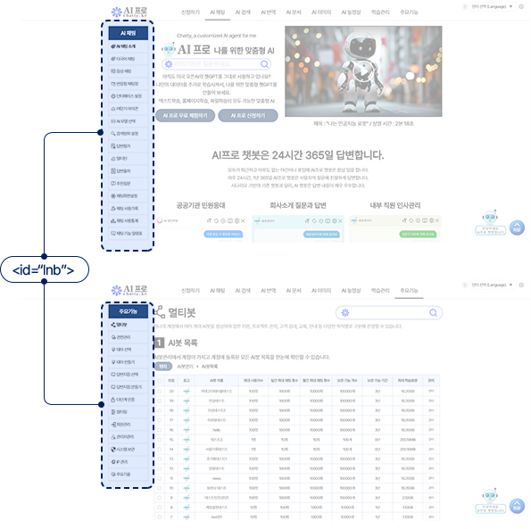 - 메뉴별로 서로 다른 LNB, RNB 등의 내비게이션 영역 또한 유연하게 등록해둘 수 있습니다.
