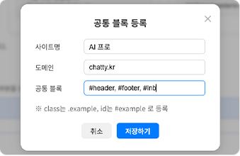 동일한 도메인이라면 HTML 코드의 <header>, <footer> 등과 같은 공통 영역을 등록해 보세요.