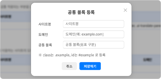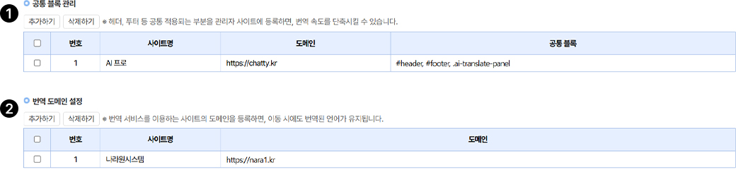 홈페이지 번역 시, 사이트의 공통 블록을 관리하고 홈페이지 이동 시에도 번역 유지할 사이트를 등록합니다.