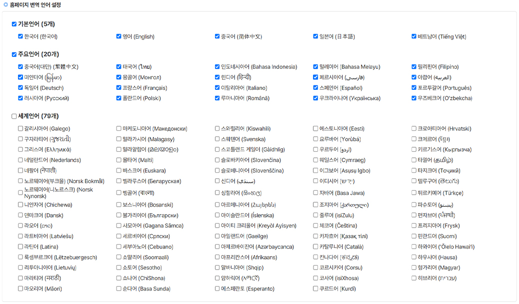 번역 기능 중 홈페이지 번역에 대한 설정입니다.