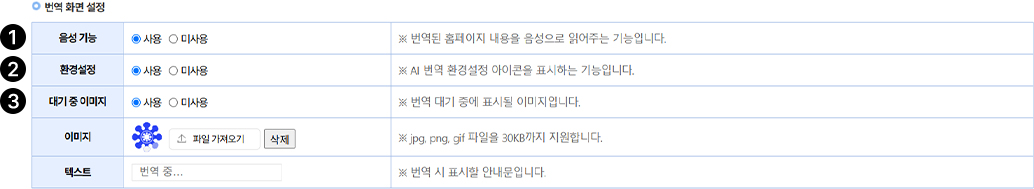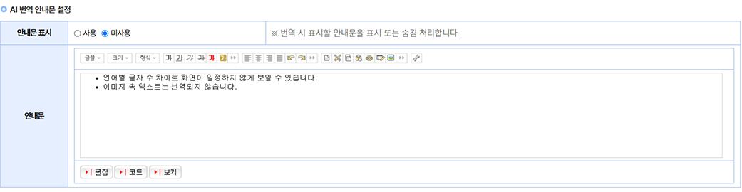 홈페이지에 번역 기능을 도입했을 때 설정할 수 있는 기능입니다.