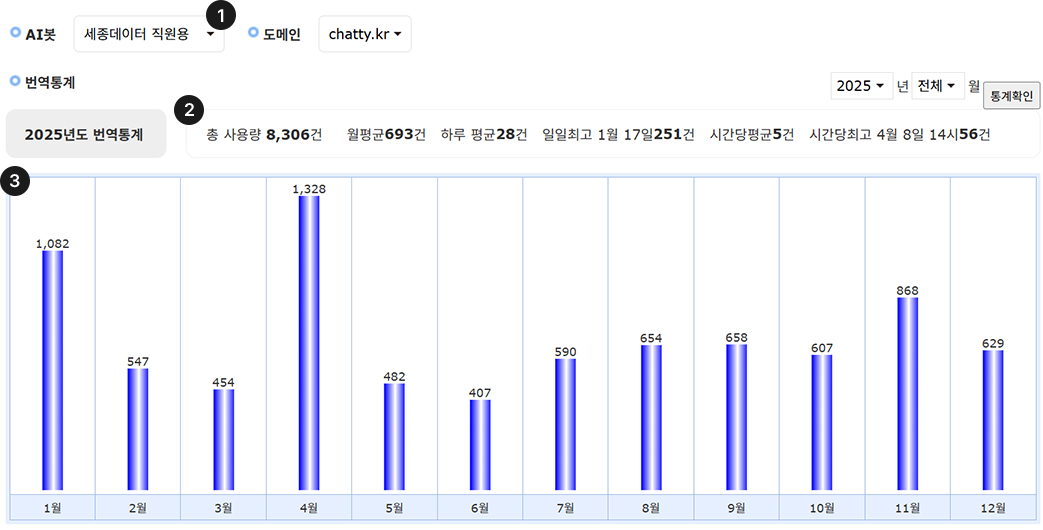 번역 사용통계를 통해 1년 동안의 채팅 추이를 확인할 수 있습니다.